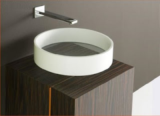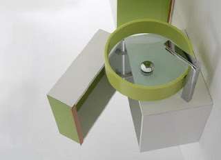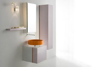 O colectie de mobila pentru baie caracterizata prin alternarile de culori si dintre suprafetele transparente si suprafetele solide care scot in evidenta jocul volumelor.